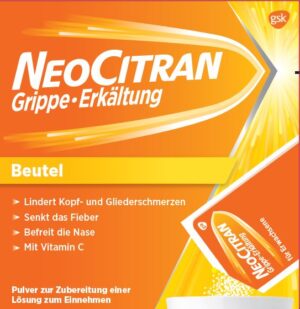 NeoCitran Grippe/Erkältung bringt Erleichterung bei Grippe und Erkältungssymptomen, lindert Beschwerden wie Frösteln, Glieder- und Kopfschmerzen, Schnupfen und senkt das Fieber. Paracetamol wirkt fiebersenkend und schmerzstillend. Pheniraminhydrogenmaleat wirkt sekretionshemmend. Pheniraminhydrogenmaleat und Phenylephrin bewirken eine Abschwellung der Nasenschleimhaut, bringen dadurch Erleichterung bei Schnupfen und erlauben ein freieres Atmen. Ascorbinsäure (Vitamin C) hilft, den während Fieber und Grippe erhöhten Vitamin-C Bedarf zu decken.